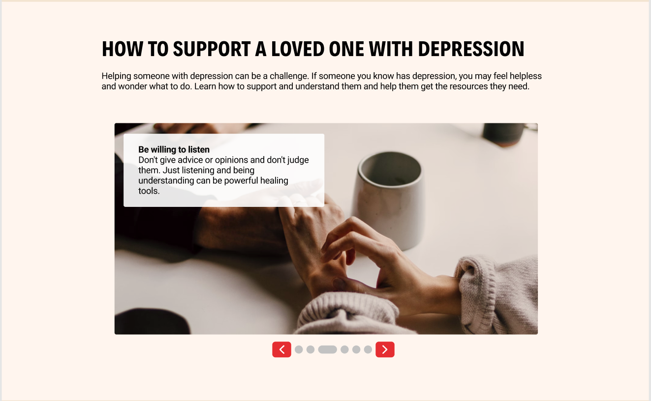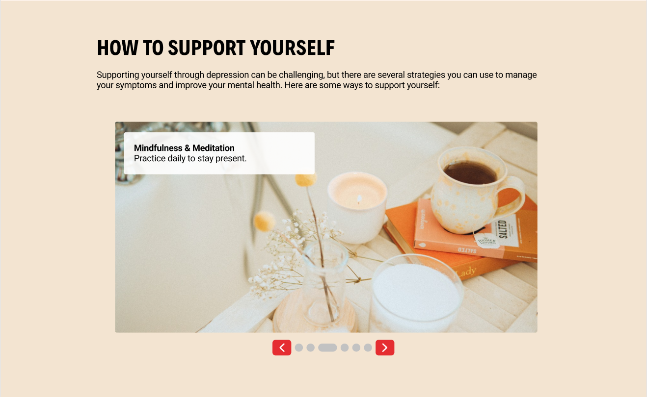 Making the website more interactive and digestible, creating a visual imagery, and advising the user can give strategies and how to support a person living with depression’s well-being.